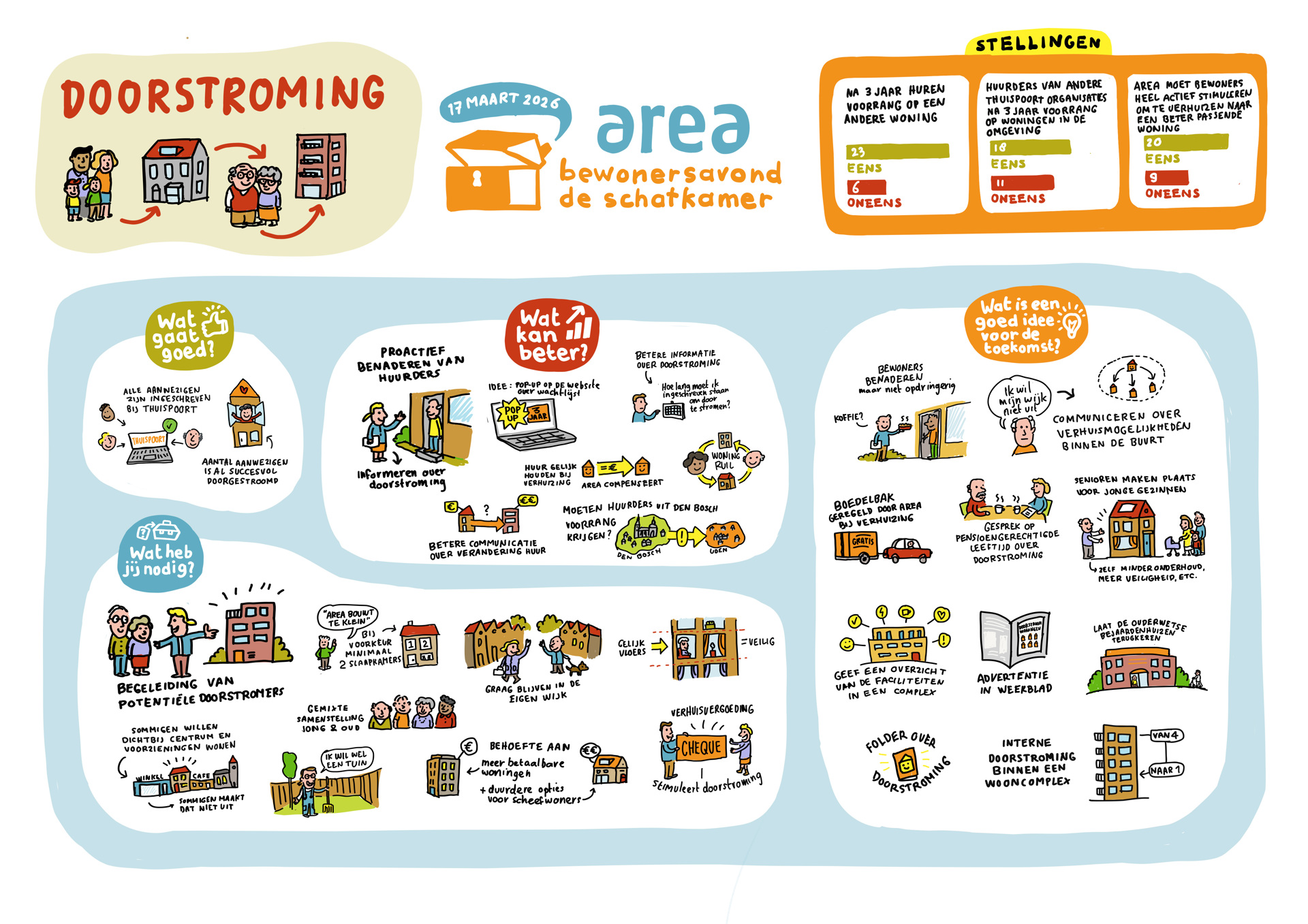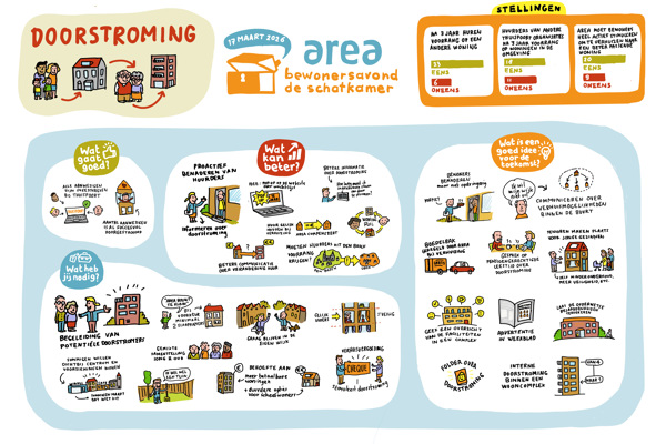 De praatplaat hieronder laat zien wat we met bewoners hebben besproken en wat nodig is om doorstroming makkelijker te maken.